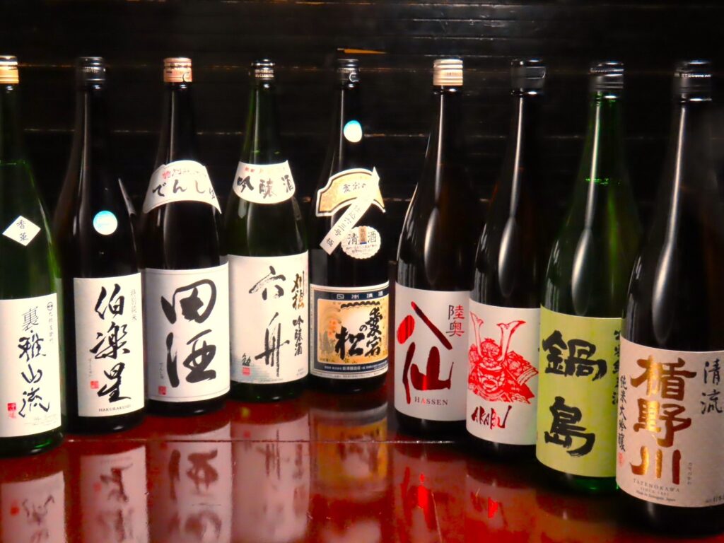 日本酒は伯楽星、赤武、楯の川、刈穂、陸奥八仙、裏雅山流、紀土、鍋島など東北の地酒をメインに、焼酎や果実酒も豊富です。